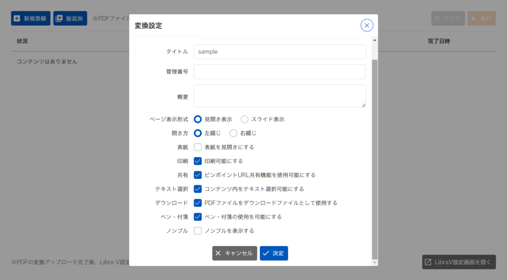 2. タイトル名や各種設定を入力し、【決定】ボタンをクリックします。